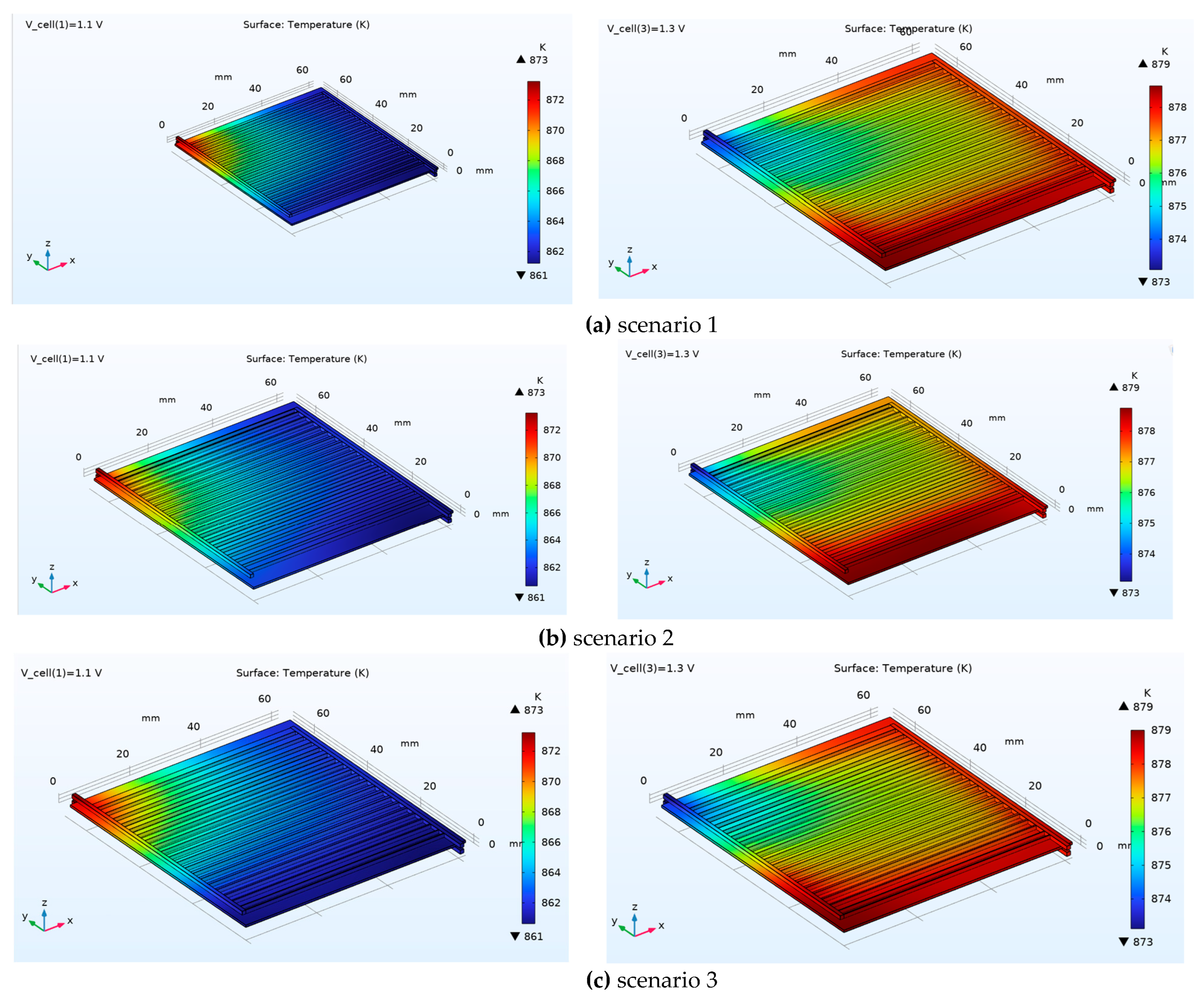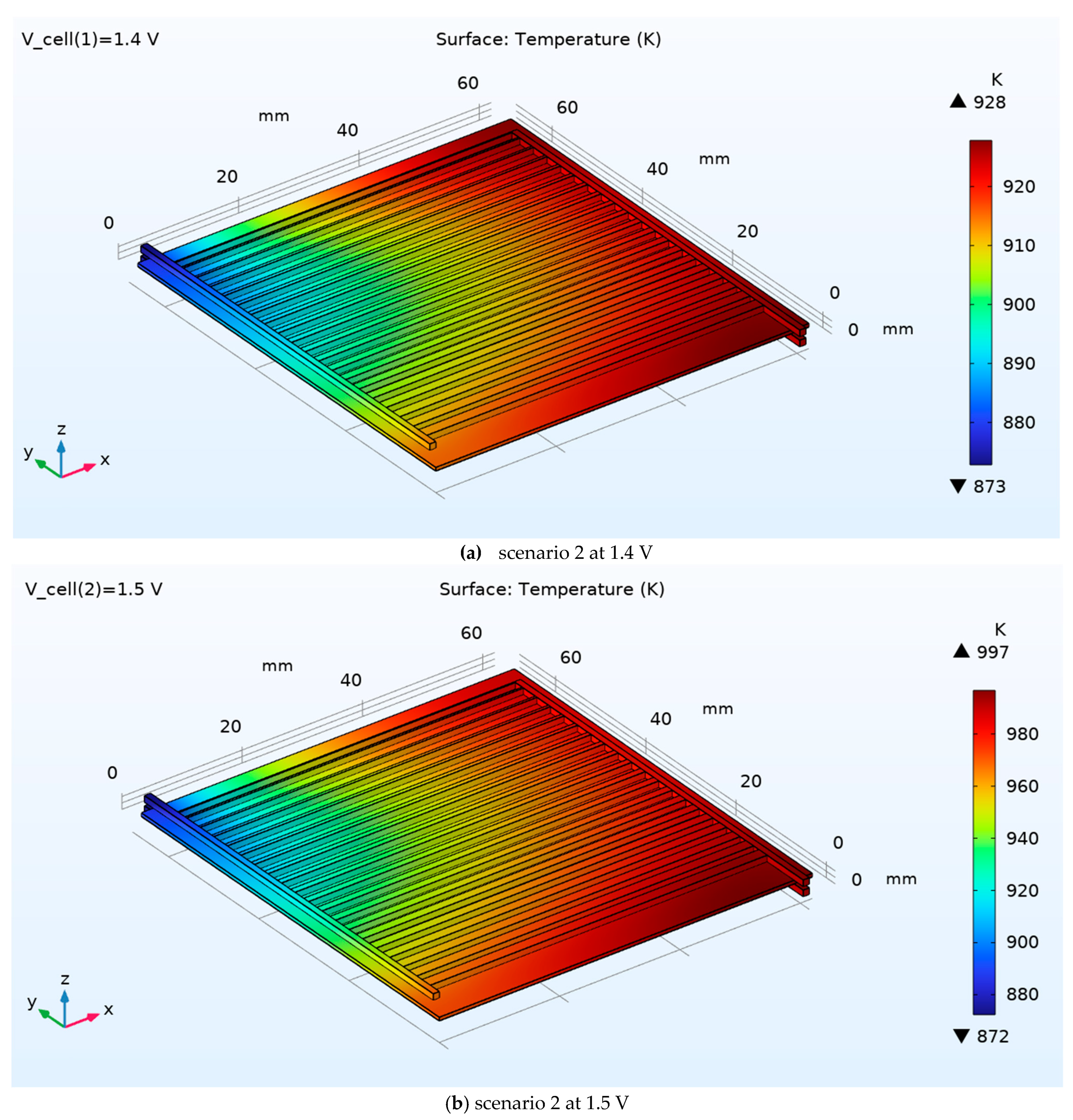 - Wang, H.; Xiao, L.; Liu, Y.; Zhang, X.; Zhou, R.; Liu, F.; Yuan, J. Performance and thermal stress evaluation of full-scale SOEC stack using multi-physics modeling method. Energies 2023, 16, 7720. [Google Scholar] [CrossRef]