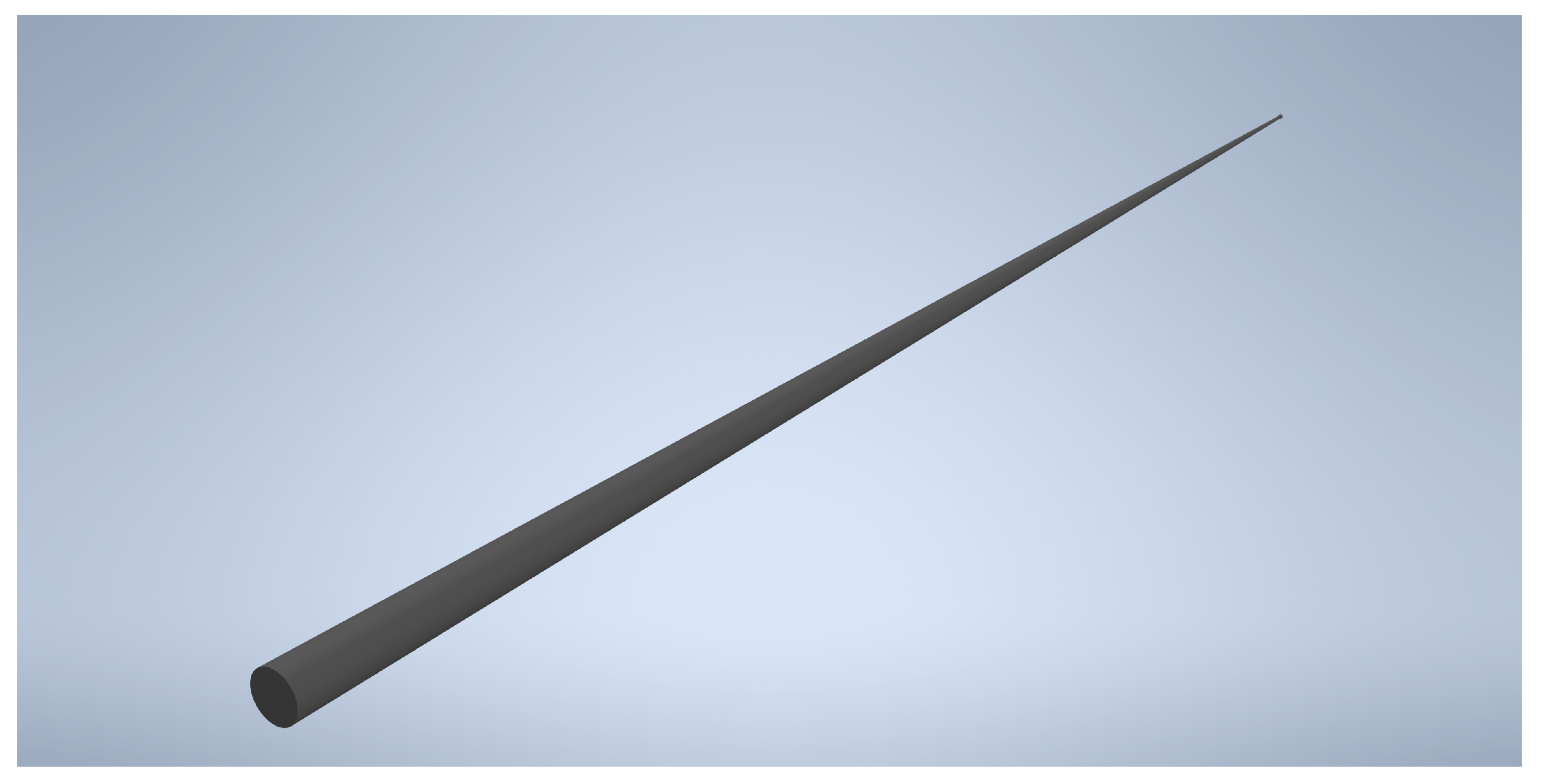 - Outer section: The main structure of the artificial whisker is constructed from 3D printing resin with an F69 from Resione, the company Dongguan Godsaid Technology Co., Ltd., Dongguan, Guangdong, China. This material possesses a Shore Hardness of 60–75 A that corresponds to a semi-flexible nature, allowing the whisker shape to remain intact even when collisions with the environment occur. A tensile strength of 7.9 MPa and a temperature range from 5 °C to 120 °C provide suitable characteristics for the application. These mechanical properties are the ones closest to the Keratin that composes cat whiskers in comparison to other commercial resins that can be used with 3D printing technology, particularly for the Shore Hardness coefficient, which provides a similar stiffness. The outer section is printed on a Phrozen Sonic Mighty 4K resin printer using a mm layer height, s exposure time per layer, and a post-printing process that includes washing with isopropyl alcohol and an additional curing process using a Wash and Cure station from Creality.