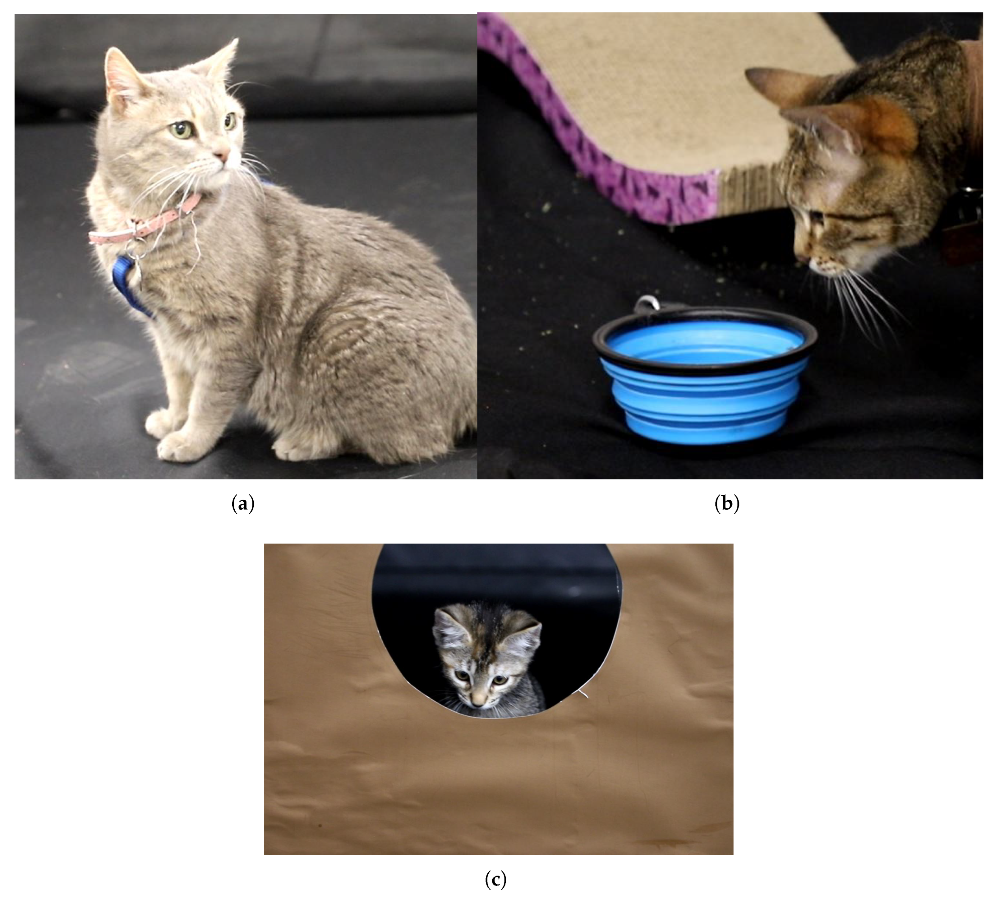 - Contact stimulus: A set of objects is placed in the experimental area to identify how the whiskers are used to explore the environment. The first element corresponds to a box with a 20 cm diameter hole that the subjects use to exit. It is expected that this part allows for the study of the motion of the whiskers on cats in closed environments, as shown in Figure 4c. The second element corresponds to a scratching post and a remote-controlled mouse to analyze how the cats interact with them using their whiskers.