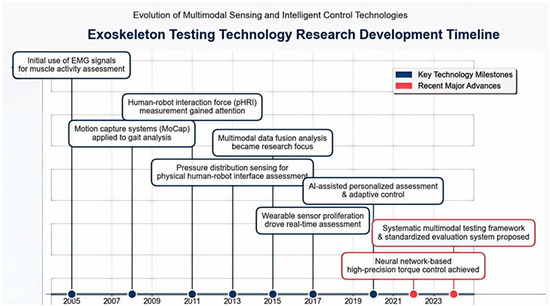 Figure 1 illustrates that the research progress of exoskeleton testing technology is closely linked with the evolution of evaluation methodologies. Early studies primarily relied on surface electromyography (sEMG) signal analysis to quantify the extent of muscle activation [12]. Subsequently, motion capture systems were introduced for the analysis of gait. With technological advancement, the evaluation of mechanical properties at the physical human–robot has received increasing attention, and pressure distribution sensing technology has been employed to measure the contact force distribution between exoskeletons and the human body. In recent years, multi-dimensional data fusion approaches have emerged as a research focus. By synchronously acquiring multi-dimensional data, including EMG, kinematics, dynamics, and metabolic energy consumption, a comprehensive performance evaluation system has been established. Recent advancements indicate that artificial intelligence (AI)-based personalized evaluation algorithms and adaptive control strategies are advancing the development of exoskeleton testing toward greater intelligence and standardization [13].
