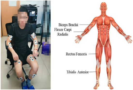 The core principle of electromyography (EMG) involves recording muscle electrical activity to characterize the functional state of the neuromuscular system. During muscle contraction, motor neurons generate electrical discharges, which induce action potentials in muscle fibers. These electrical signals are acquired and amplified through electrodes to generate EMG signals. Variations in these signals (e.g., amplitude and frequency) are strongly correlated with the degree of muscle activation and the onset of muscle fatigue. EMG signal analysis involves multiple stages, including detection, processing, and classification, utilizing techniques such as time-domain/frequency-domain analysis, wavelet transform, time-frequency distribution, and artificial intelligence-based methods [14]. As a non-invasive technique, surface electromyography (sEMG) has become an essential component in biological control and evaluation for the development of modern exoskeleton technology. It plays a crucial role in optimizing exoskeleton design, investigating the use of muscle signals for controlling exoskeleton operations, and acquiring novel insights into neuromuscular reorganization [15]. Therefore, analyzing EMG signal characteristics can yield critical information about muscle activity, which can be applied to clinical diagnosis, rehabilitation assessment, or human–robot interaction control.