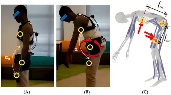 Human-Exoskeleton system modeling, adapted from [32]. Postures: (A) Initiation of symmetric stooping. (B) Intermediate posture during dynamic lifting, demonstrating trunk-pelvis coordination. (C) Twisting motion during handling, inducing higher lumbar shear and torque. Annotations: Circles represent optical motion capture markers for defining body segments and joint centers. Arrows indicate key mechanical vectors: Red for exoskeleton assistive forces. This model quantifies the exoskeleton’s impact on parameters like erector spinae activation and L5-S1 joint force to evaluate assistive efficacy.