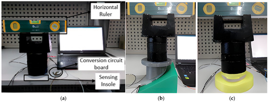 (Color online) Single-point test platform:(a) plane loading test; (b) bevel loading test; (c) curve loading test, adapted from [48]. (a) Plane Loading: Simulates level walking/standing. Provides baseline calibration and gait phase (stance/swing) detection thresholds. (b) Bevel Loading: Simulates slope walking. Validates sensor robustness against shear forces for reliable operation on uneven terrain. (c) Curve Loading: Simulates contact with protruding objects or center of pressure transition. Tests sensitivity to localized pressure for slip prevention and balance intervention.