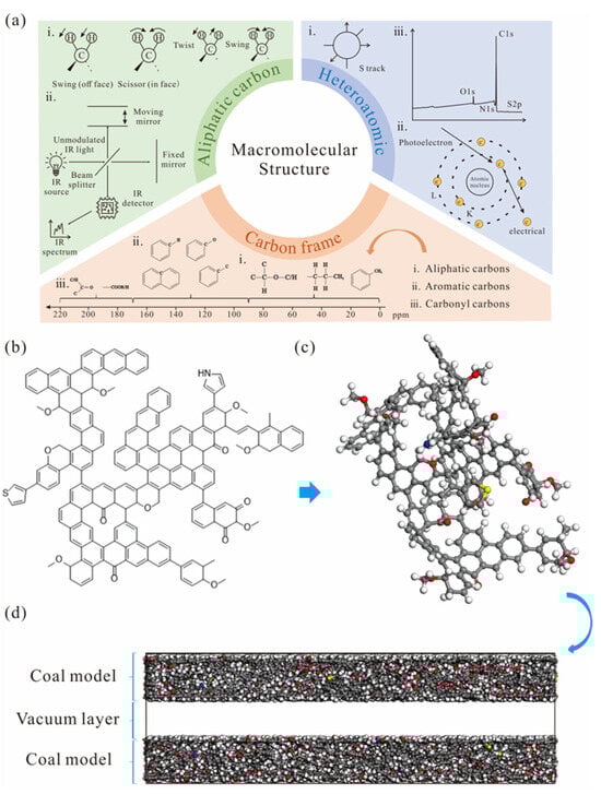 To construct a molecular model of the coal sample, approaches including X-ray photoelectron spectroscopy (XPS), Fourier Transform Infrared (FTIR) and 13C Nuclear Magnetic Resonance Spectra (13C NMR) were employed to characterize molecular bonding and elemental distribution (Figure 1).