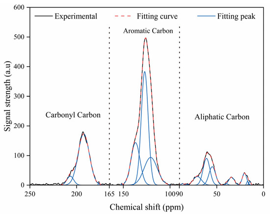 13C NMR experiments were performed using an Bruker AVANCE III HD spectrometer (Saarbrücken, Germany) equipped with a magnetic field strength of 9.4 Tesla. Spectra were recorded at room temperature using a Bruker magic-angle spinning (MAS) probe (Saarbrücken, Germany) with a rotation rate of 10 kHz, a contact time of 2 ms, and a recycle delay of 3 s. Spectral deconvolution and fitting were performed using PeakFit software. Structural assignments of coal macromolecular components were based on chemical shift regions [53,54]. The bridge carbon ratios, which can be used to infer the presence of aromatic carbons, were calculated using Equation (1).