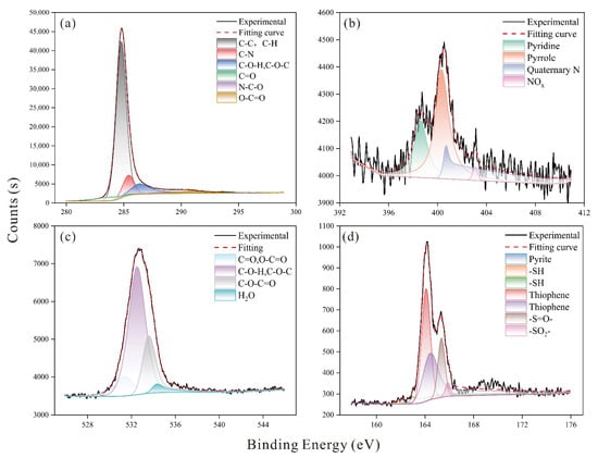Peak fitting for XPS spectra: (a) C spectra, (b) N spectra, (c) O spectra, (d) S spectra.