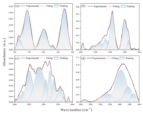 Peak fitting for FTIR spectra: (a) aromatic hydrocarbons spectra, (b) oxygen-containing functional groups, (c) aliphatic hydrocarbons spectra, (d) hydroxyl hydrogen bond spectra.
