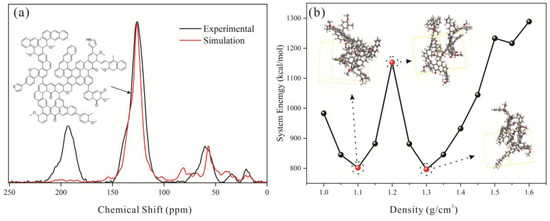 The macromolecular structure was developed through initial model construction based on statistical analysis of spectral data. The final two-dimensional macromolecular structure was confirmed through iterative validation against the 13C NMR spectra. Initially, the aromatic hydrocarbons in the carbon backbone were arranged according to the structure derived from NMR peak fitting. The aliphatic carbons were then added, followed by the incorporation of heteroatom-containing functional groups. Notably, 13C NMR analysis exhibited significant signal amplification in the carbonyl, carboxyl region (165-220 ppm) due to spinning sideband artifacts, necessitating exclusion of this spectral region during experimental–model correlation [48,57]. The final optimized structure (C186H125O14NS) shows excellent agreement with the spectra, as illustrated in Figure 5. To convert the two-dimensional configuration into a three-dimensional model, Materials Studio (MS) was employed to perform hydrogenation, geometry optimization and molecular dynamics optimization.