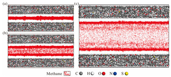 Snapshots of methane adsorption at 10 MPa with different pore sizes: (a) 0.4 nm, (b) 1 nm, (c) 2 nm.