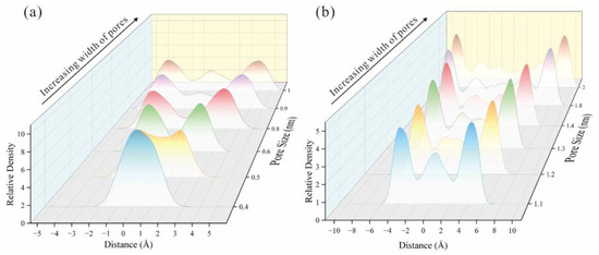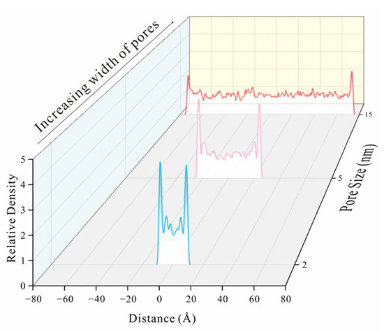 By examining the methane adsorption snapshots in models with different pore sizes, the methane formed adsorption layers on the coal matrix surface (Figure 7). As pore size increases from 0.4 nm to 2nm, the number of adsorption layers increases from one in 0.4 nm pore size to three in 1 nm pore size and four in 2 nm pore size. It is also evident that the density of each adsorption layer varies, with the density increasing as the layer approaches the coal matrix [32]. Methane density distribution curves, perpendicular to the coal matrix, were derived from extracted molecules (Figure 8 and Figure 9). In 0.4 nm pores, methane forms a monolayer adsorption structure, as shown by relative density distributions. At 0.5 nm pore size, slightly exceeding methane’s 0.38 nm molecular diameter, a pseudo-bilayer adsorption configuration forms between pore walls. At 0.6 nm, a distinct bilayer adsorption structure emerges, with molecules adopting crosswise or intercalated arrangements rather than side-by-side packing [6]. At 0.9 nm pore size, two distinct monomolecular adsorption layers form. A low central peak in density distributions indicates a secondary adsorption layer forming at 0.9 nm (Figure 8). This secondary layer stabilizes and becomes clearly defined at 1 nm. With further pore enlargement, bilayer adsorption dominates [60]. At 1.4 nm pore, two symmetric density peaks appear near each coal matrix surface. Initially, interactions between the adsorbate and adsorbent form the first adsorption layer, as pressure increases and space permits, adsorbate–adsorbate interactions give rise to a second layer [61,62]. The differential peak intensities between adsorption layers reflect decreasing coal matrix-methane interaction forces with increasing distance from the surface. With the gradual increase in pore size, the gap between the adsorption layer and the stacking density layer becomes smaller [55,60].