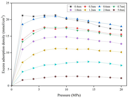 (3) Excess methane adsorption capacity increased from 0.4 nm to 1.2 nm, with a sharp increase at 0.6 nm and 1.0 nm due to additional adsorption layers. Beyond 1.2 nm, excess adsorption capacity decreased with increasing pore size.