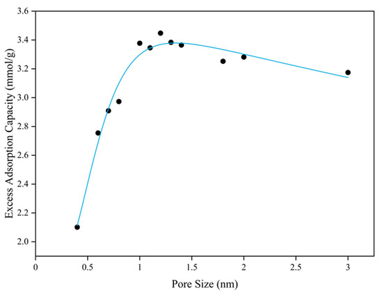 Pore size was varied by adjusting the distance between opposing coal matrix surfaces, thereby altering the pore volume. Therefore, with the coal matrix structure held constant, the maximum excess adsorption capacity was plotted against pore size (Figure 11). Methane adsorption capacity increases with pore size up to 1.5 nm, with significant enhancements at 0.6 nm and 1 nm. As can be seen from Figure 8, when the pore size increases to 0.6 nm, two adsorption layers begin to appear. As the pore size gradually increases to 1.0 nm, a secondary adsorption layer starts to emerge. This suggests that additional adsorbed molecular layers enhance adsorption capacity [63]. In small pores, spatial confinement restricts methane to a single adsorption layer on the coal matrix, leading to a reduced excess adsorption capacity. As pore size increases, additional adsorption layers form, causing abrupt increases at 0.6 nm and 1.0 nm. Accordingly, larger pores accommodate more adsorption layers and exhibit higher adsorption capacity. However, beyond 1.2 nm, adsorption capacity gradually decreases as increased pore volume diminishes the nanoconfinement effect, weakening coal–methane interactions and reducing adsorption [64]. The nanoconfinement effect, where nanoscale pores akin to carbon nanotubes impose spatial restrictions, enhances methane mobility, alters molecular distribution and propagation, and increases adsorption [65,66]. Below 1.2 nm, nanoconfinement enhances adsorption. So excess adsorption increases with pore size within this small range. Beyond 1.2 nm, further pore enlargement weakens confinement of methane molecules, and excess adsorption decreases as pore size increases. And no further adsorption layers develop. Similarly, Figure 8 and Figure 9 show that as pore size increases, the relative density of the adsorption layer gradually converges toward the density at the pore center. And no further adsorption layers develop.