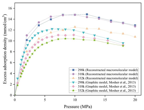 However, few studies have explored how functional group–induced variations cause differences in methane adsorption simulations between the RMM and graphite models. The model developed in this study incorporates diverse oxygen-containing and heteroatom functional groups, methyl substituents, and other moieties to reflect the coal. Methane excess adsorption isotherms for both the RMM and graphite models in 1 nm pores were determined at various temperatures and are shown in Figure 12. For both models, increasing temperature decreases methane adsorption and this effect is more pronounced in the graphite model. As temperature increases, gas molecules gain kinetic energy, increasing intermolecular distances and reducing interaction energies, which weakens the adsorption potential wells of the pore walls and converts more adsorbed gas into the free phase [49]. In the RMM, the isotherms at 298 K and 318 K differ only marginally, with some adsorption points even showing slight increases at the higher temperature. A similar trend has been observed in other RMMs, where an increase in temperature around 300 K initially promotes methane adsorption on the coal matrix. With further temperature elevation, the adsorption capacity eventually declines [74]. These results indicate that the coal model, incorporating diverse functional groups, exhibits markedly different temperature sensitivity compared to the graphite model. Therefore when the temperature and pressure are changed, the functional groups’ response mechanisms are also different [50,75,76].