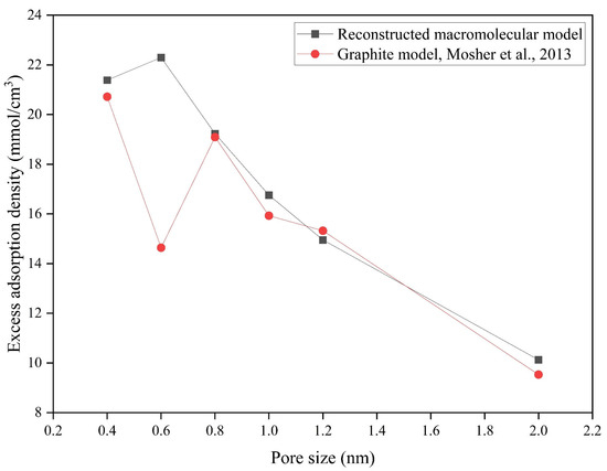 The excess adsorption isotherms of both the coal model and the graphite model were compared at 298 K across various pore sizes (Figure 13). Although both models follow the same general trend, the graphite model consistently underestimates the methane adsorption capacity of coal across various pore sizes. This deviation is particularly significant at a pore size of 0.6 nm, where the underestimation reaches 34.34% (Table 8). This behavior may arise from the molecular arrangement of methane within the pore space. The previous study demonstrated that CO2 molecules form parallel adsorption layers in graphite slit pores, and methane likely adopts a similar configuration [77]. In Mosher et al.’s monolayer graphite model, the excess methane adsorption amount uptake in 0.6 nm pore size is lower than in 0.5 nm pore size [32]. By contrast, Song et al.’s ABA-stacked graphite model shows greater uptake in 0.65 nm pore size than in 0.55 nm pore size [31]. Zhang et al. further demonstrated this pore size-dependent behavior in smooth versus rough graphite models, where methane adopts a zipper-like configuration to accommodate more molecules than a linear arrangement [6]. In our RMM, differing affinities of functional groups similarly enable higher methane loading than linear packing, explaining the divergent adsorption behavior at 0.6 nm between the RMM and graphite models.