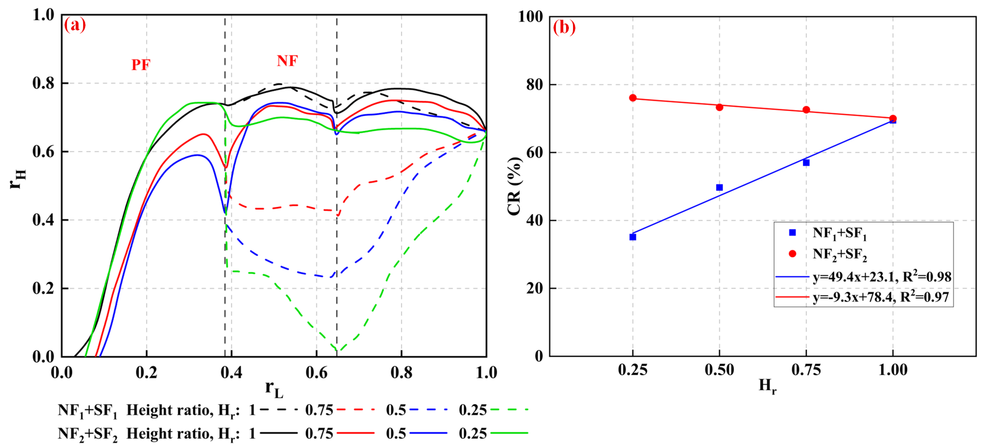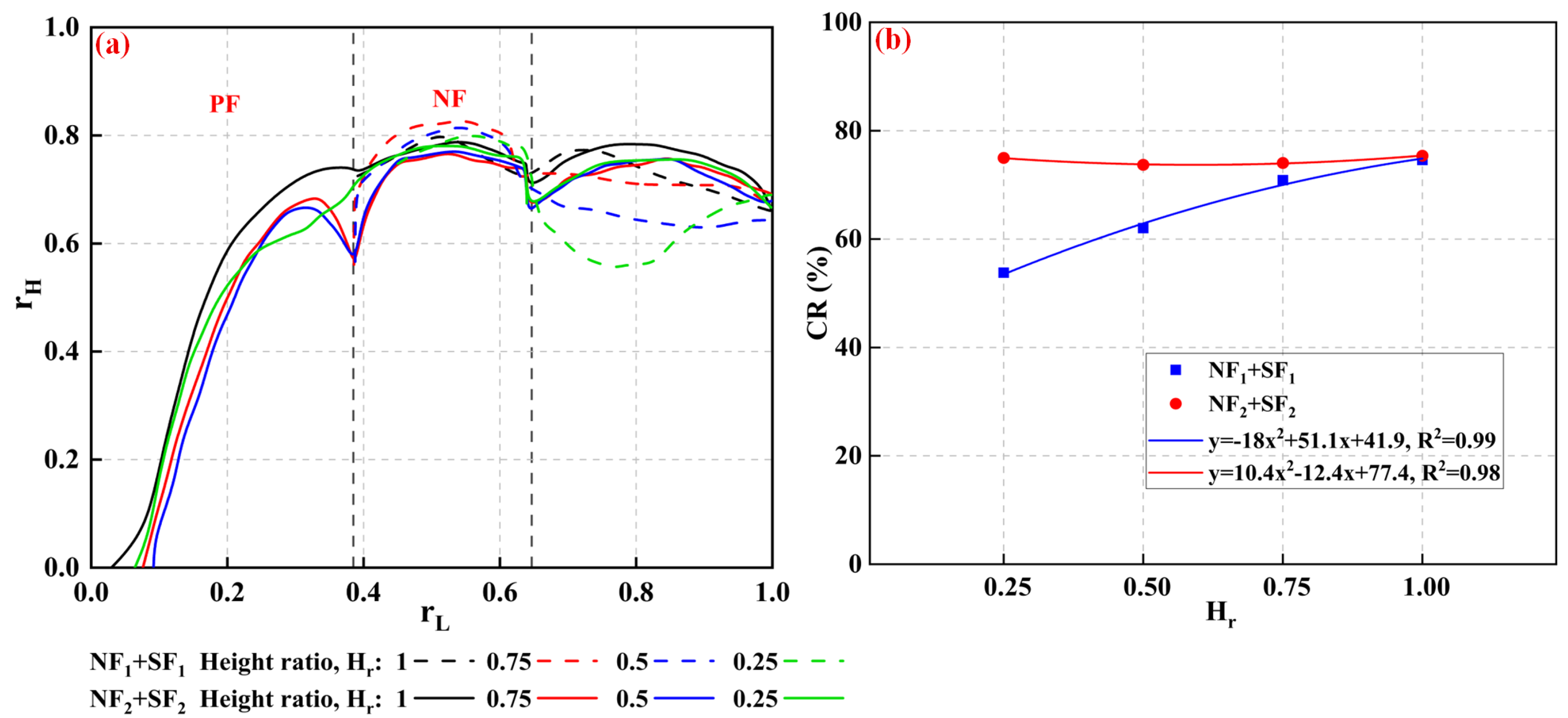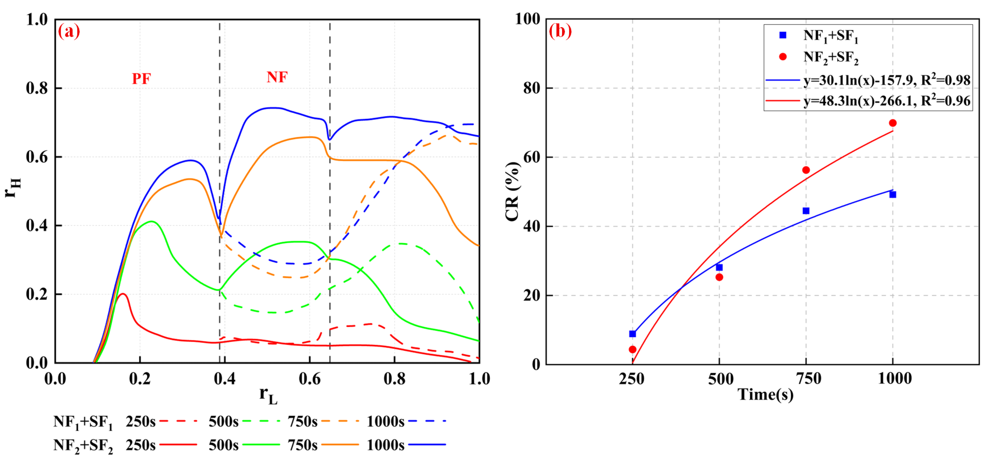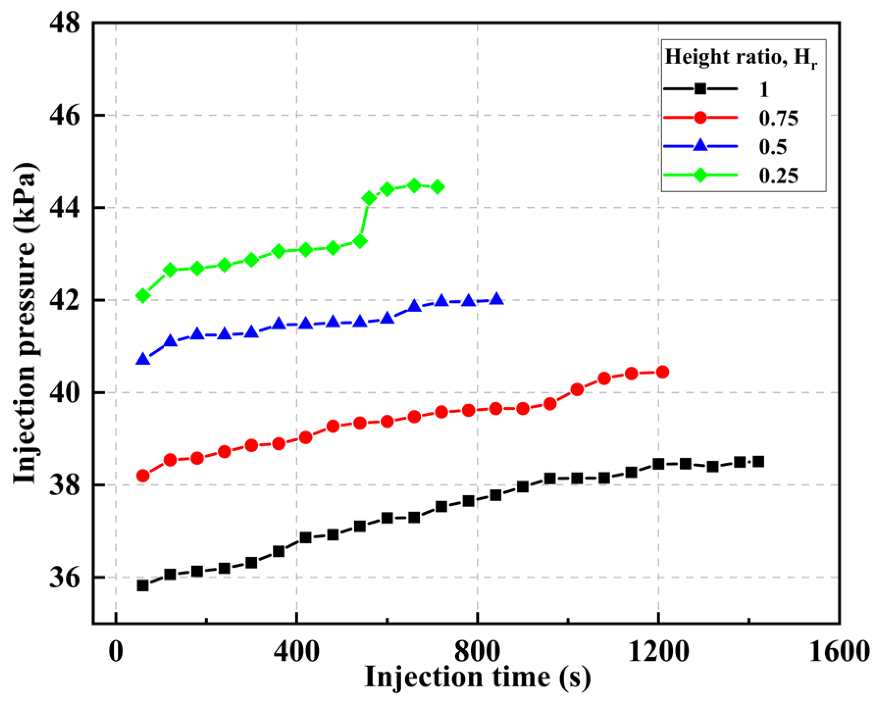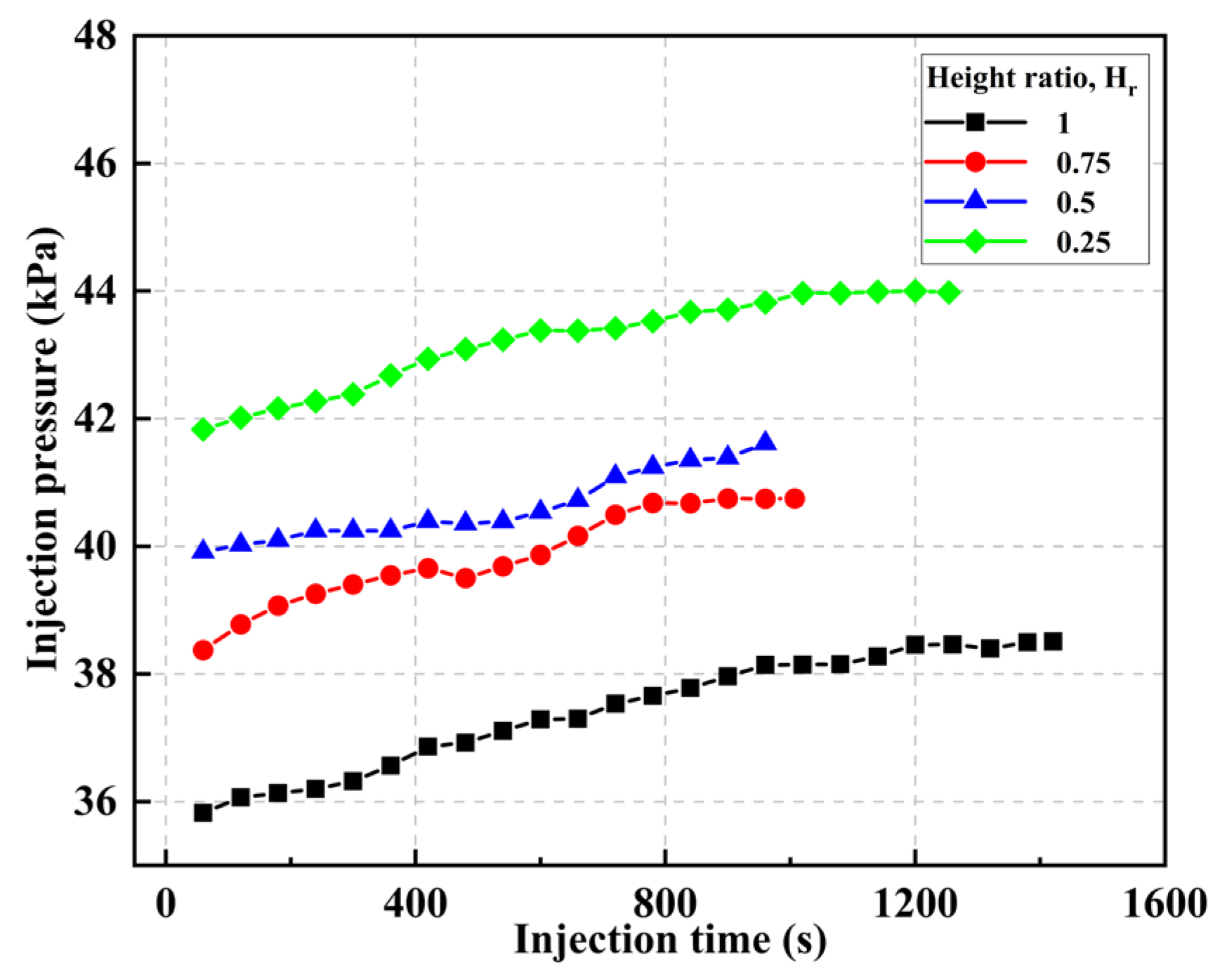 - At a height ratio of 0.25, the branch is located in the lower section, and sand bridging is likely to occur once the sand bed in the primary fracture reaches a certain height. In naturally fractured reservoirs, it is recommended to increase the proportion of small-sized proppants (e.g., 70/140 or 200 mesh) to ensure smooth transport through narrow fractures and minimize the risk of premature bridging.