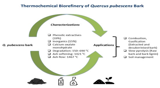 Despite the present growing interest in utilizing lignocellulosic biomass for biorefinery applications, barks only recently started to be valued as a resource [13,14,15]. In general, oak barks are known to be rich in phenolic compounds, lignin, and minerals such as calcium, which make them promising feedstocks for thermochemical processes [16]. These components can be converted into a wide range of value-added products, including antioxidants, antimicrobial agents, biochars, activated carbons, and solid catalysts. The bark of Quercus pubescens has not been previously studied in this context. The aim of this study is to provide the first detailed chemical and thermal characterization of Q. pubescens bark and evaluate its potential for thermochemical biorefinery applications.