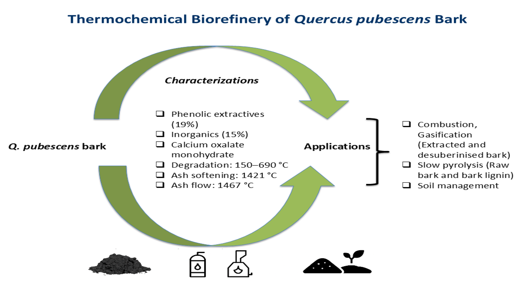 Advancing circular bioeconomy in thermochemical biorefineries requires species-specific data that link biomass composition and thermochemical performance. Here, we provide the first integrated thermochemical dataset for Quercus pubescens bark combining FT-IR, XRD, XRF, TGA, and measured ash fusion temperatures (AFT). The results reveal that bark is enriched in phenolic extractives (21.2%) and inorganics (15%), with calcium oxalate monohydrate (COM) dominating the inorganic fraction, as confirmed by FT-IR and XRD. Thermal decomposition occurs between 150 °C and 690 °C. Pyrolysis follows diffusion-controlled kinetics, with apparent activation energies for bark and its fractions ranging between 70 and 103 kJ mol−1. Extraction increases the activation energy of bark. The ash exhibits a high AFT (softening: 1421 °C, flow: 1467 °C), placing this feedstock within the low-slagging, moderate-fouling range compared to other lignocellulosics. The observed COM-to-CaCO3/CaO transformation upon heating contributes to the elevated AFT. Reactivity analyses of bark fractions support thermochemical biorefinery routing of fractions: extracted bark (EB) and desuberinised bark (DB) are highly reactive and well-suited to combustion/gasification, whereas raw bark (B) and Klason lignin (KL) exhibit higher thermal stability and yield more persistent char, favoring slow pyrolysis for biochar production. Such routing strategies optimize energy recovery and also enable co-products with environmental co-benefits.