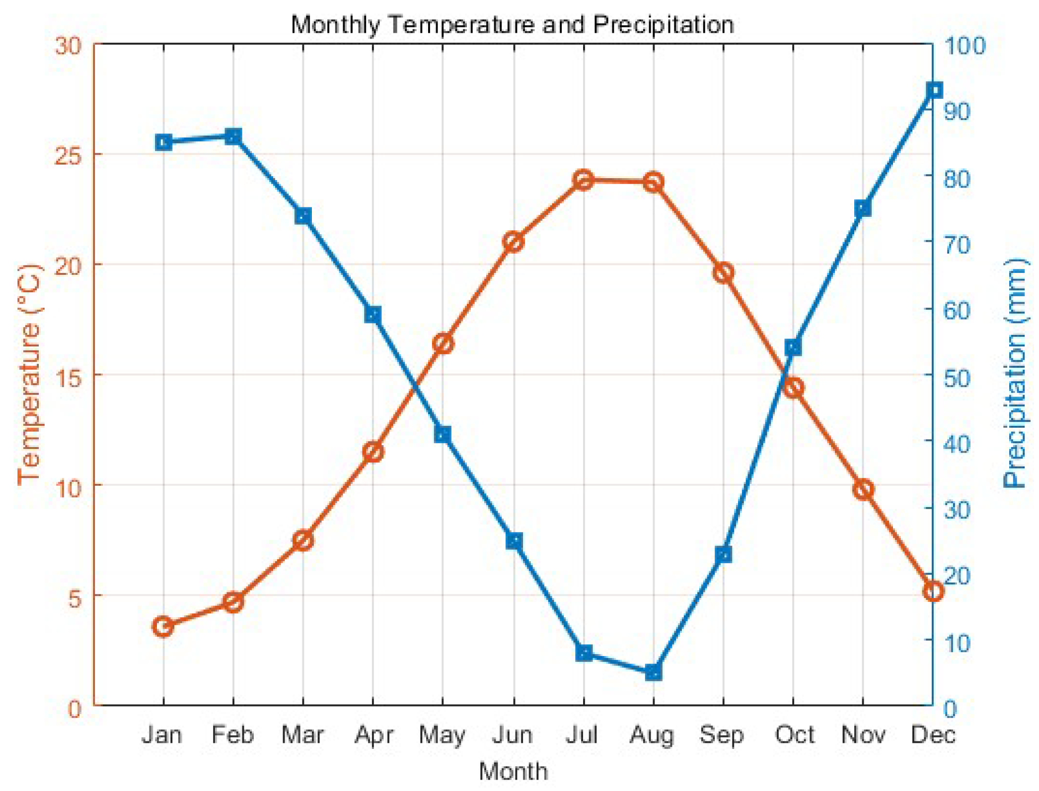 The bark samples of Q. pubescens mature trees with 40 years of age were collected from Ivrindi Province of Balıkesir city in the Northwestern part of Turkey. The sampling area is located at 39°36′31″ N, 27°26′42″ E with 230 m altitude, and has a mean annual 628 mm rainfall and 13.4 °C temperature. The climate of the sampling area is classified as a Csa (Hot-summer Mediterranean climate) according to the Köppen climate classification. The relative humidity is lowest in July (53.95%) and highest in December (83.71%). On average, August has the fewest rainy days (1.57 days) and December has the highest rainy days (11.40 days) (Figure 1).