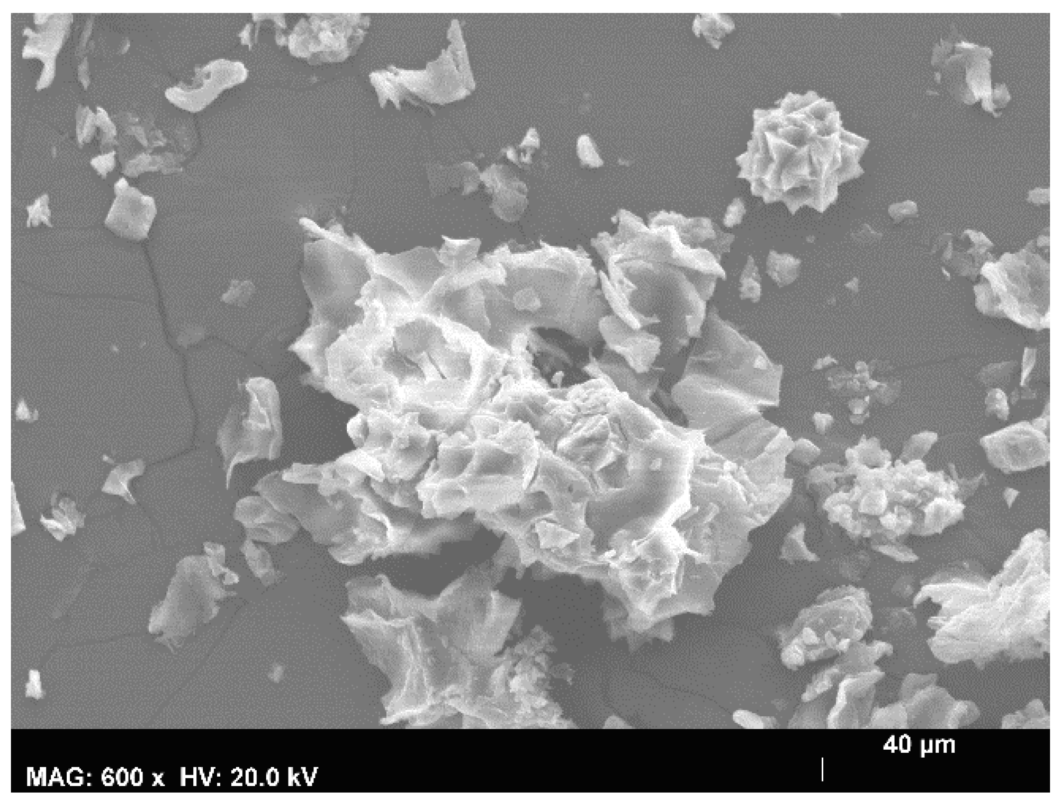 SEM observations of the Q. pubescens powdered bark reveal a fragmented, plate-like surface with angular fracture planes, a morphology consistent with brittle phloem and cork cells that fracture and originate cellular and cell wall fragments (Figure 2). The anatomical analysis of Q. pubescens bark, described in detail by Lavrič et al. [29], indicates the formation of early and late phloem in agreement with our SEM results. Cork cells from the periderms could be observed, which suggests that the bark forms a rhytidome (Figure A1) [12]. Several inorganic crystals are observed, presumably in sclereid cells between the cork and phloem cells. The presence of calcium is confirmed from the SEM and EDS results (Figure 2 and Figure A1). These results agree with previous publications and indicate that the inorganic composition of oak barks is dominated by calcium [16,30]. The inorganic composition of Q. pubescens bark seems to be similar to that of Q. cerris and Q. vulcanica [31,32].