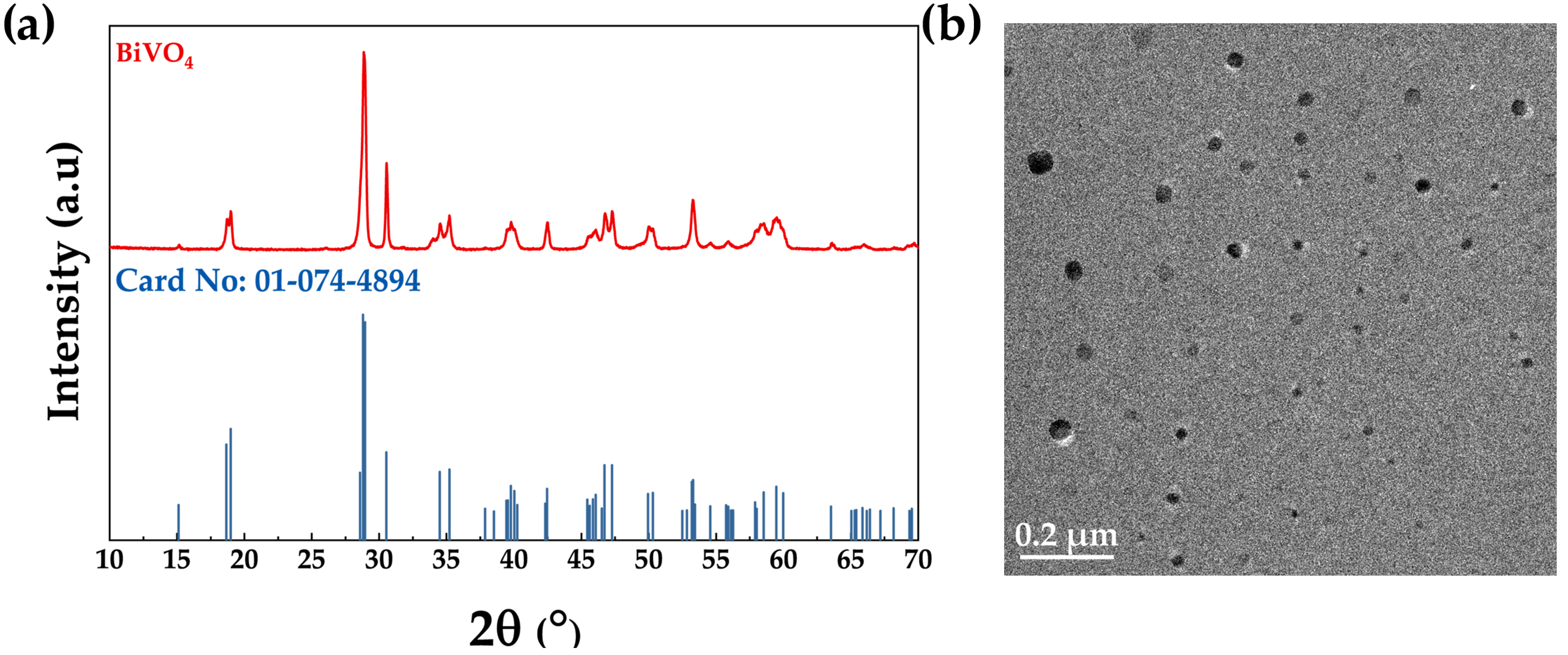 Figure 1. (a) XRD pattern of BiVO4 with reference bars (card No: 01-074-4894); (b) TEM image of BiVO4 nanoparticles.