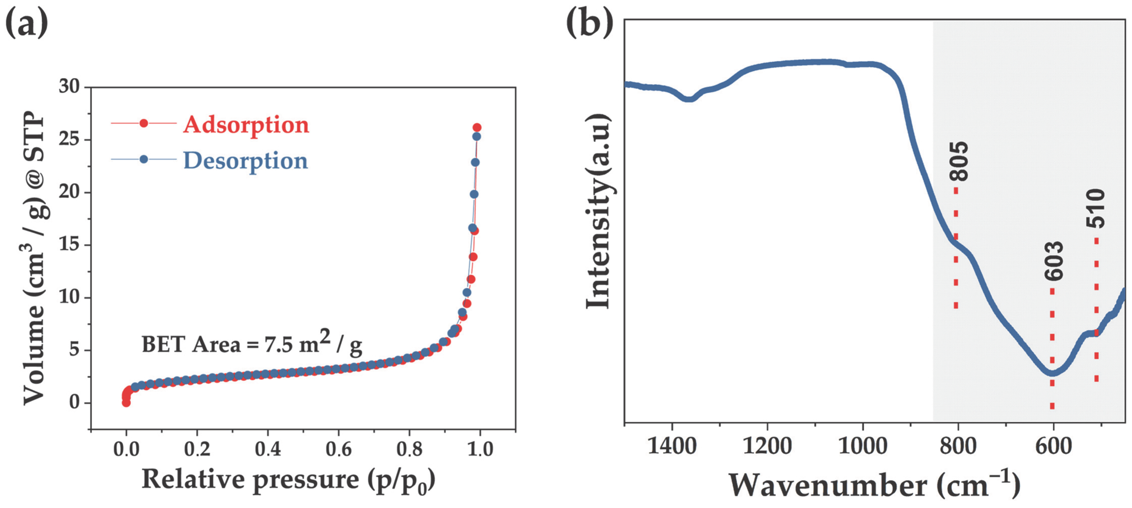 Figure 2. Textural and vibrational characterization of BiVO4: (a) N2 adsorption–desorption isotherm; (b) FTIR spectrum.