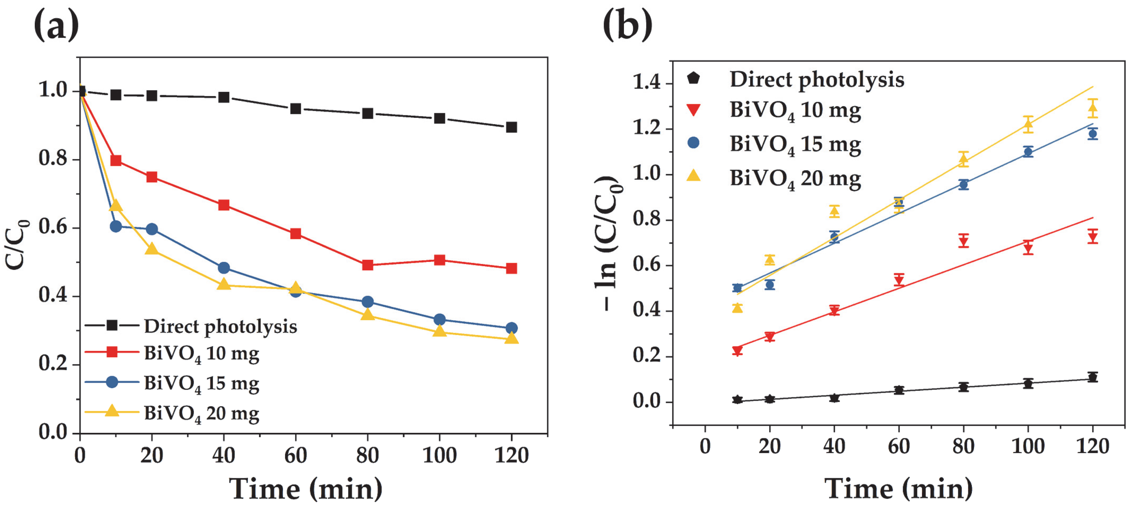 3.3. Photocatalytic Performance of the Microwave-Synthesized BiVO4