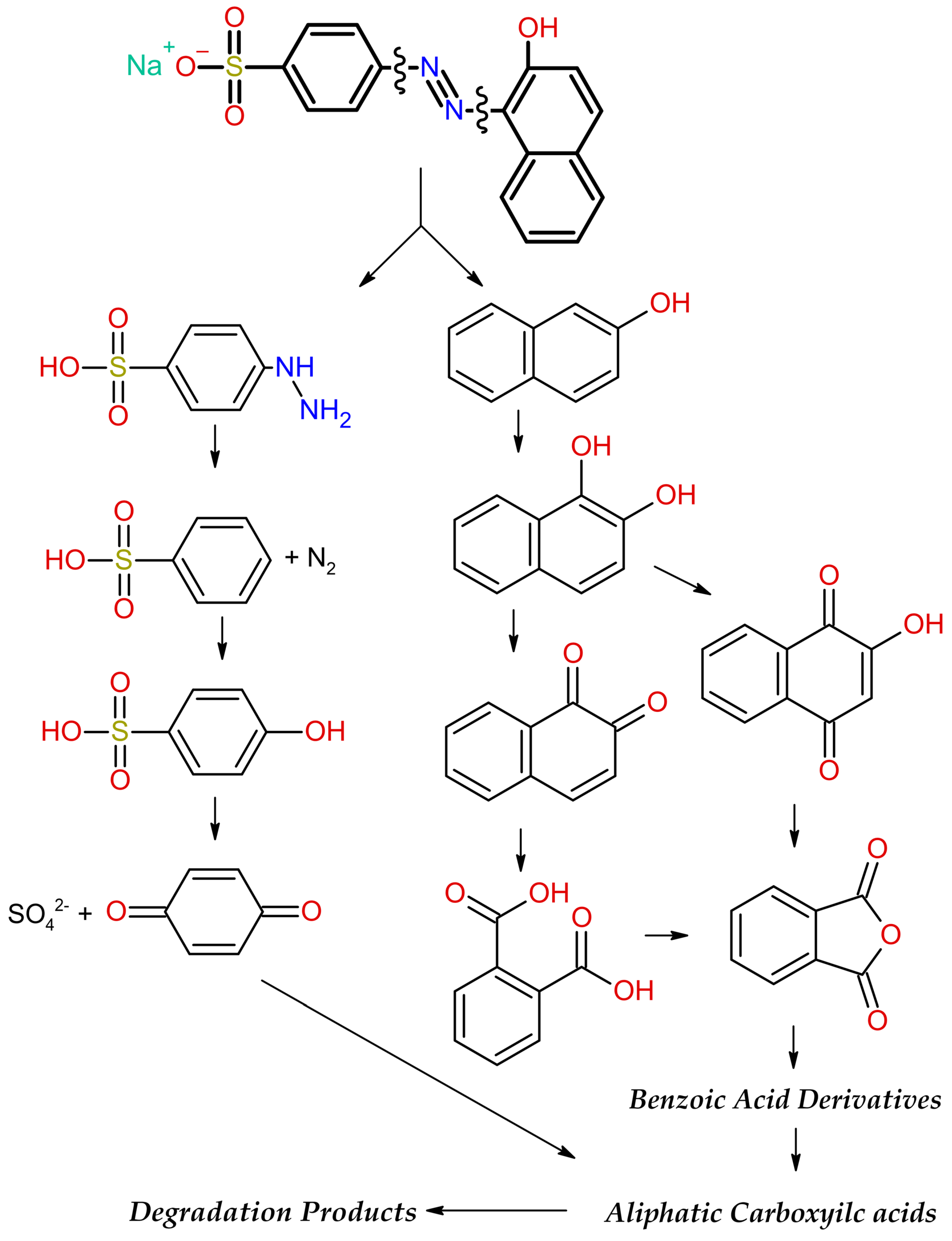 Figure 7. Plausible visible-light-driven AO7 degradation mechanism over BiVO4, from azo-bond cleavage to oxidation intermediates and lower-molecular-weight products (Modified from [42]).