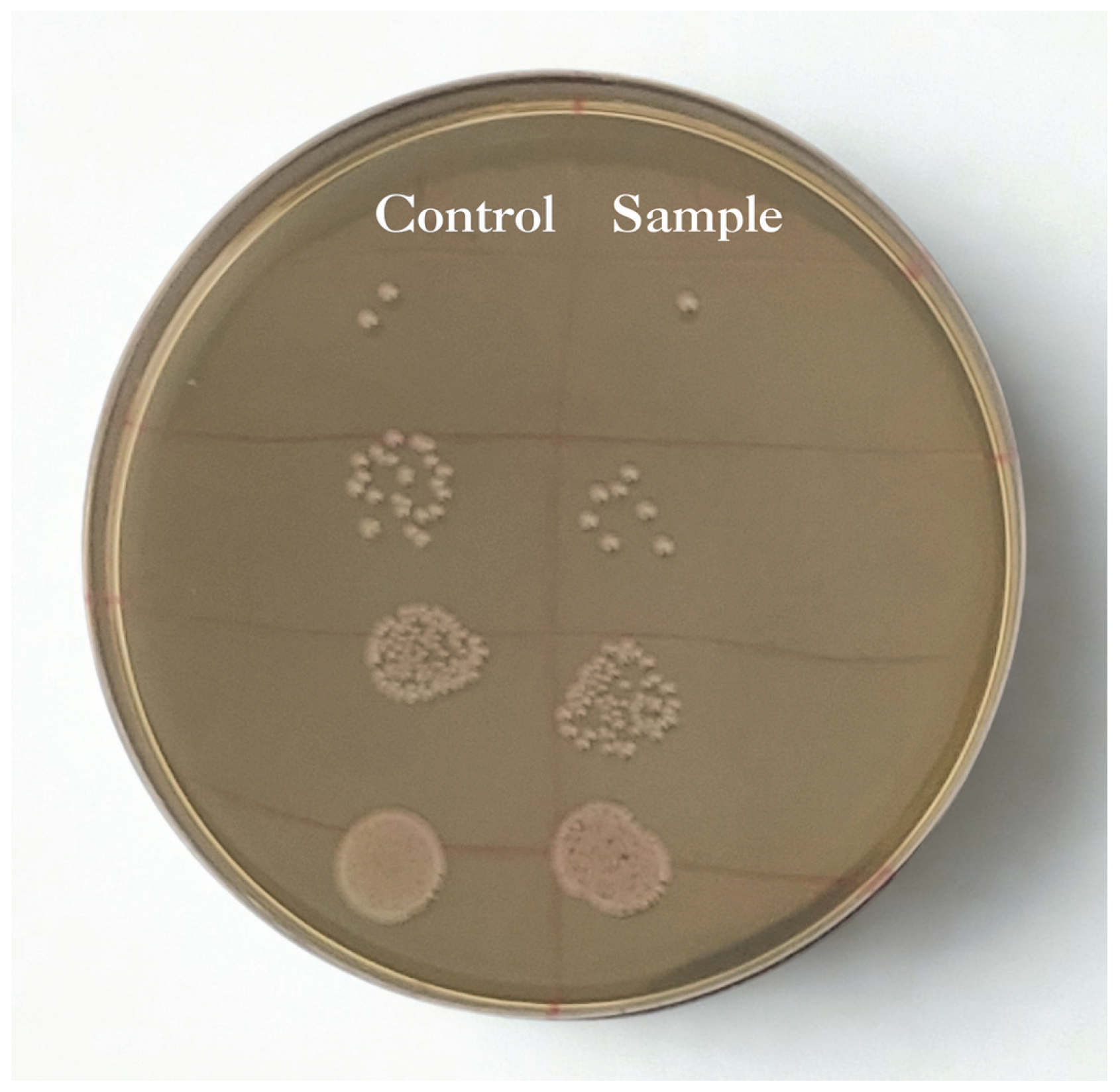 Figure 8. Photography of the TSA plate with serial dilutions of untreated E. coli (left) and the sample treated with UV-activated BiVO4 nanoparticles (right).