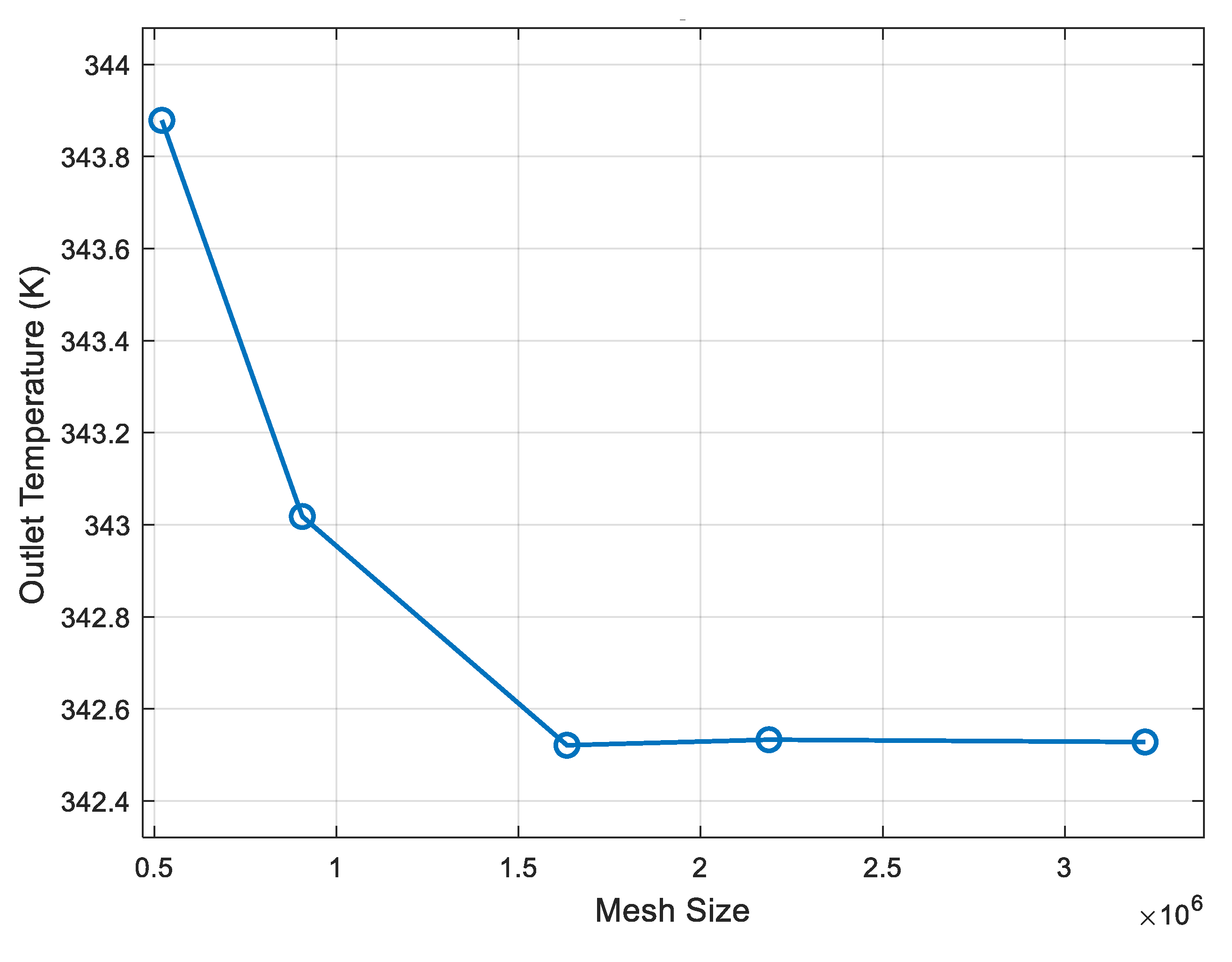 Figure 4 shows the variation in the fluid outlet temperature as a function of the mesh size used in the CFD simulation. It can be observed that as the number of elements increases, the outlet temperature converges toward a stable value. From approximately 1.6 million cells onward, the temperature variation is less than 1%, indicating that the model reaches mesh independence. Therefore, this mesh size was selected as the optimum to ensure a balance between numerical accuracy and computational cost.