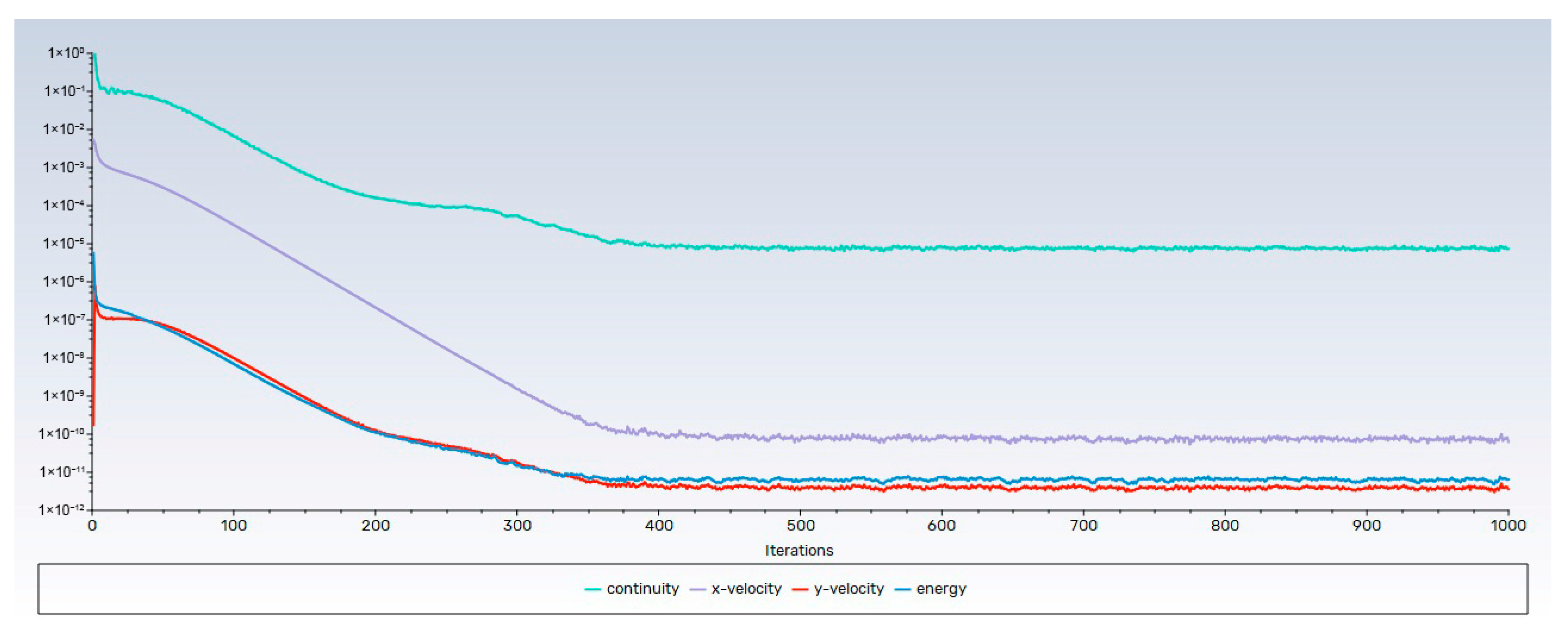Figure 5, the residuals are presented, which play a fundamental role in evaluating the convergence of numerical simulations. The residuals represent the difference between the values calculated by the model and the expected values of the flow variables, such as temperature, velocity, and pressure. Monitoring the residuals makes it possible to determine whether the simulation is stabilizing correctly or if significant discrepancies still exist that could indicate the need to adjust the model or improve mesh accuracy. In this study, an absolute convergence criterion of 1 × 10