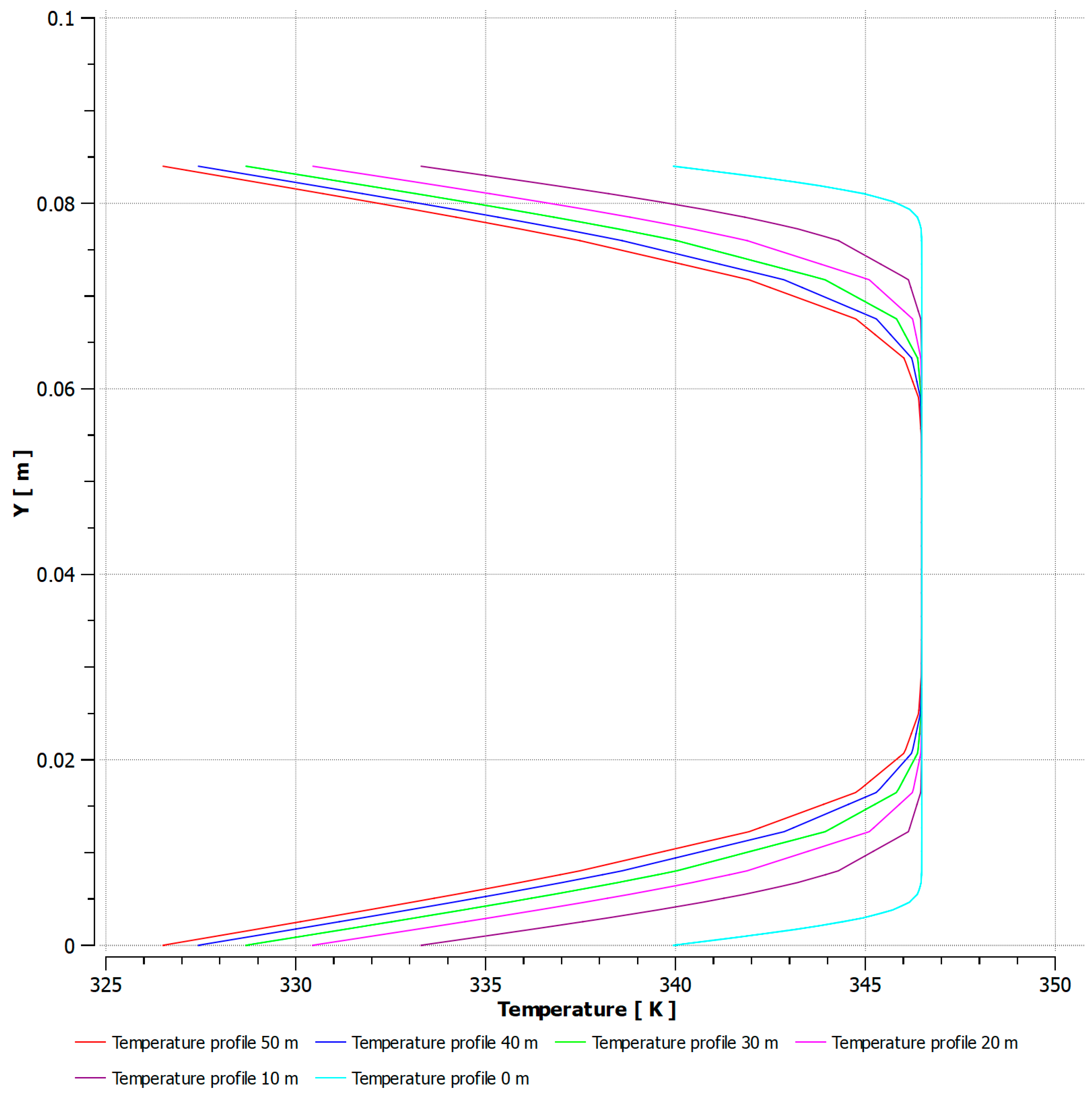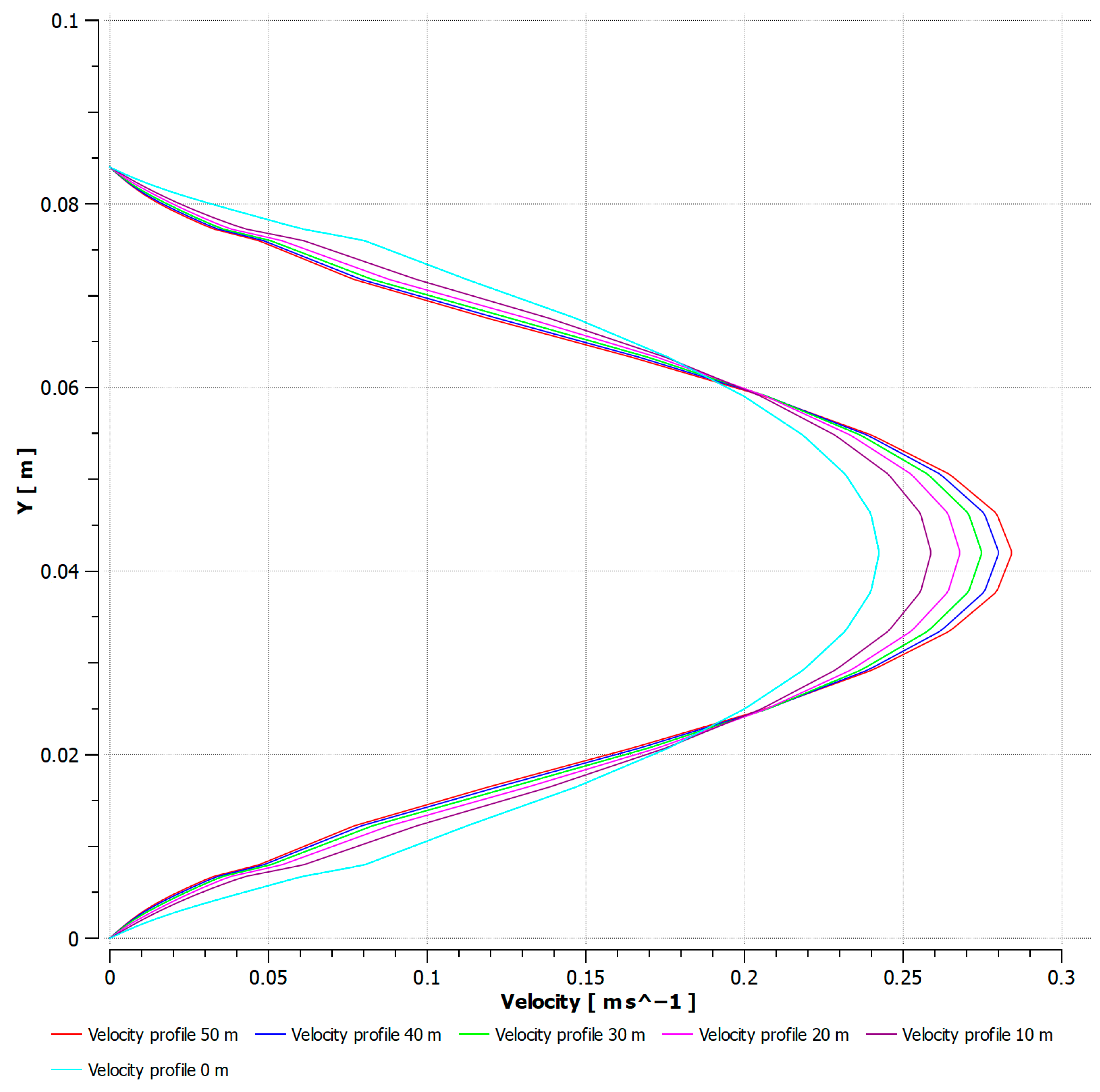 Figure 8, the velocity profiles of heavy crude oil are shown at different axial positions (0, 10, 20, 30, 40, and 50 m) along a pipeline. It can be observed that as the fluid advances from 0 to 50 m, the profiles change, shifting from a wider and more distributed shape to a narrower and more centered one. This behavior is directly related to the temperature loss of the crude along the path, which causes a progressive increase in viscosity. An increase in viscosity generates greater resistance to flow, reducing velocity near the walls and concentrating the flow in the center of the conduit.