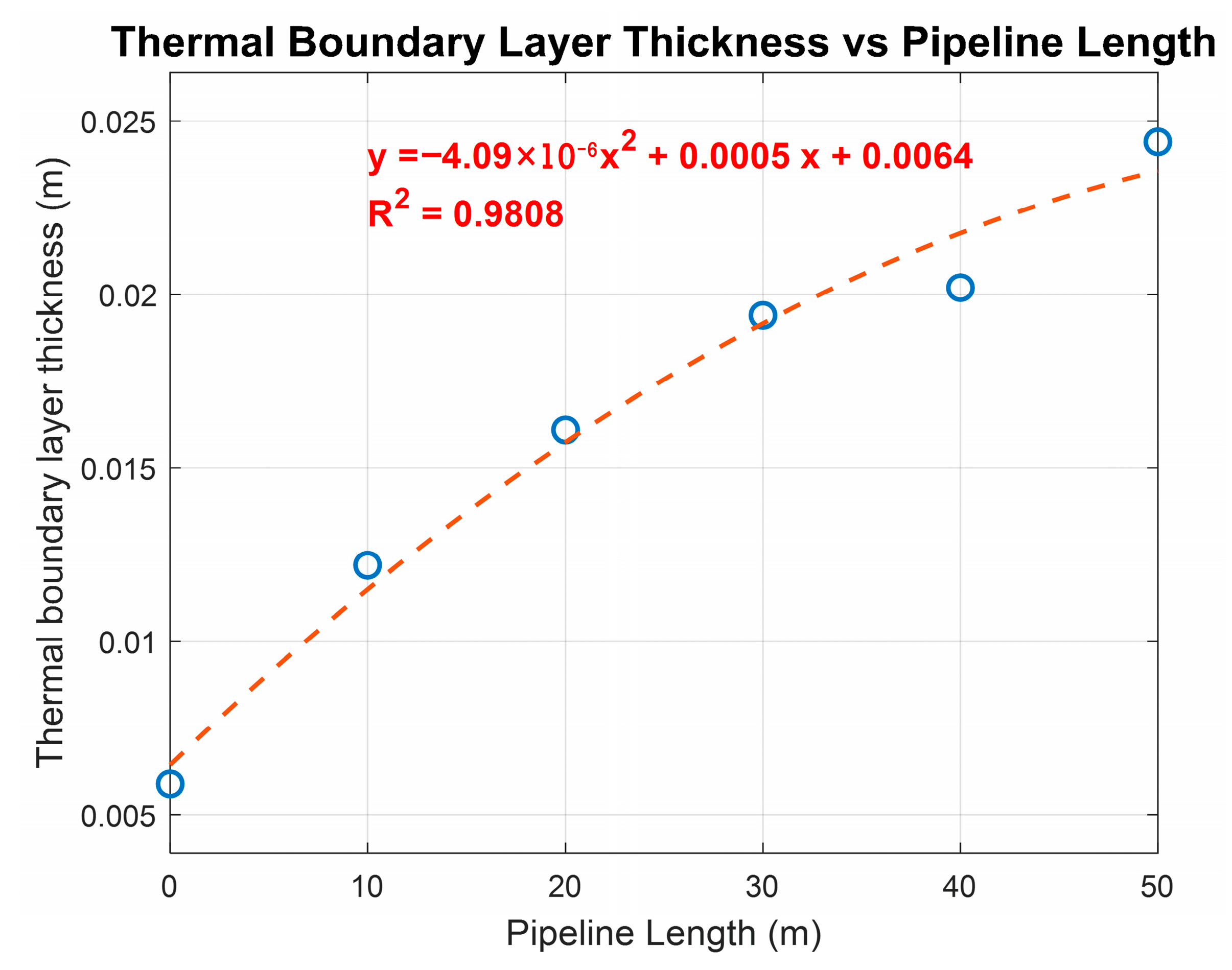 Figure 10, the relationship between the thermal boundary layer thickness and the pipeline length transporting the heavy crude oil, which is losing heat to the environment, can be observed. A second-degree polynomial fit is shown along with the coefficient of determination.