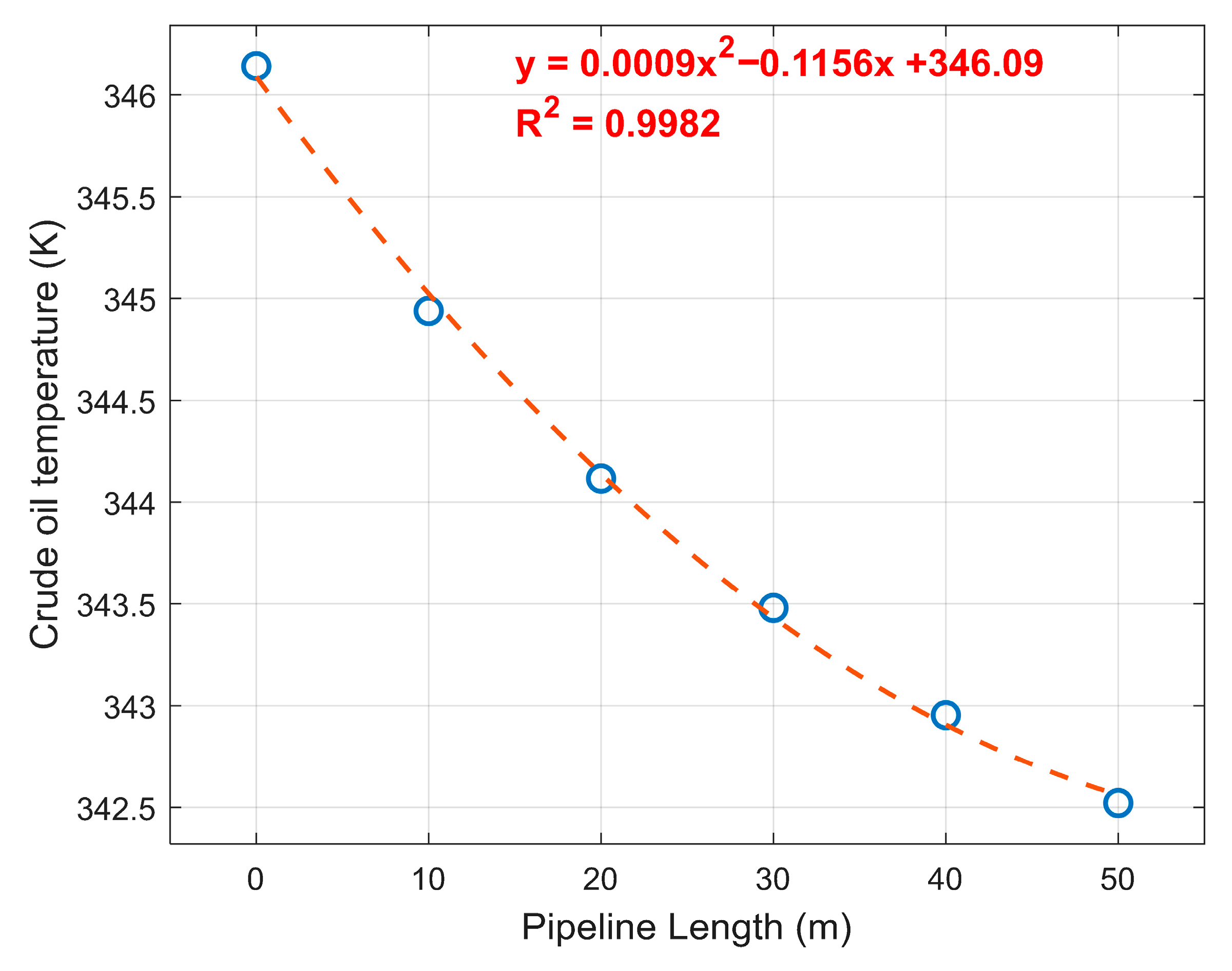 2 = 0.9982, indicating a strong correlation between the model and the obtained data. This model is useful for estimating crude temperature in longer pipelines or segments.