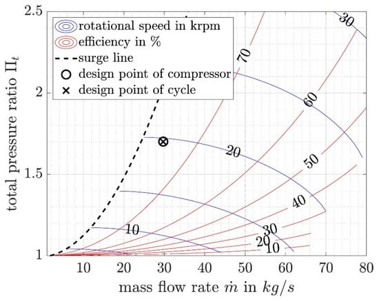 Compressor speed lines, efficiency contours, and surge line, ideal for illustrating surge/stonewall margins and performance maps in compressor twins [55].