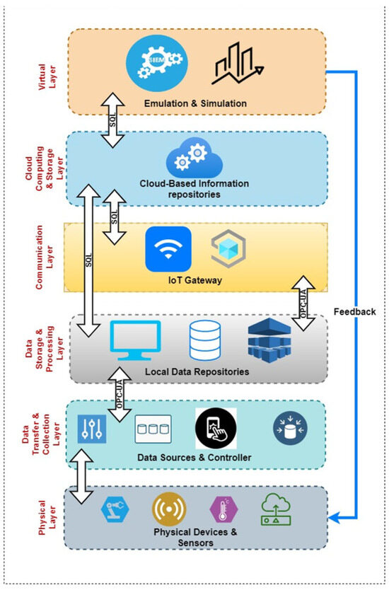 From a systems architecture perspective, researchers have formulated reference architectures for DTs that ensure scalability and interoperability. For example, the C2PS (Cloud-based Cyber-Physical Systems) architecture by Alam and El Saddik [24] provides a blueprint with separate layers for data, models, and services in a cloud-based DT environment. Data standards such as AutomationML have been proposed for structuring twin data models and facilitating data exchange between the physical and virtual components. Overall, implementing a digital twin requires bridging multiple domains: sensor and IoT engineering (for data capture), software and network engineering (for communication and cloud/edge computing), and modeling and simulation (for the virtual asset). The success of a DT project hinges on integrating these pieces into a cohesive system.