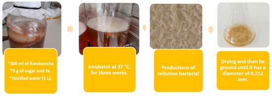 The production of this biomass involved the use of tea, glucose (3 g), and yeast (Saccharomyces cerevisiae) (5 g), mixed with distilled water (1 L). The mixture was subsequently heated to 85 °C to form the initial culture medium. Then, 300 mL of kombucha (symbiotic culture of bacteria and yeast) was added to a 3 L glass container and placed in a 15 L incubator (IO Xtemp Series Dual Incubator Oven, Hettich, Föhrenstr, Germany) at a temperature of 37 °C. During the incubation process, pH, humidity, and temperature were kept constant for all samples. The production of cellulose films was completed in approximately three weeks. After this process, the BC films were dried to remove excess water. After drying, the bacterial cellulose biomass was ground to obtain particles below 0.222 mm using a squat mill.