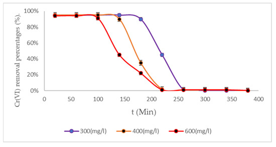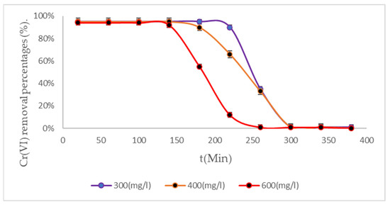 The BC (2) biomass showed ideal performances when treating water contaminated with Cr (VI) for 160 min, under initial concentrations of 600 mg/L. This biomass, at room temperature, removes interesting percentages of Cr (VI), making this biomass an ideal material for treating industrial wastewater due to its excellent experimental results [53,54]. Figure 7 shows the treatment system with the BC (3) biomass.