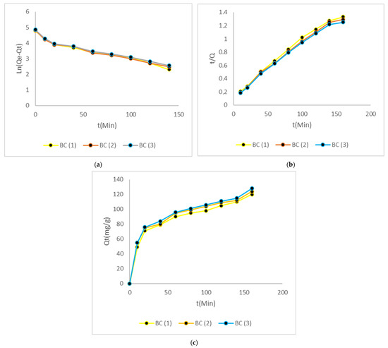 Adsorption capacities of each biomass, along with the adjustments of its isotherm. (a) Graphic isotherm of BC (1). (b) Graphic isotherm of BC (2). (c) Graphic isotherm of BC (3).