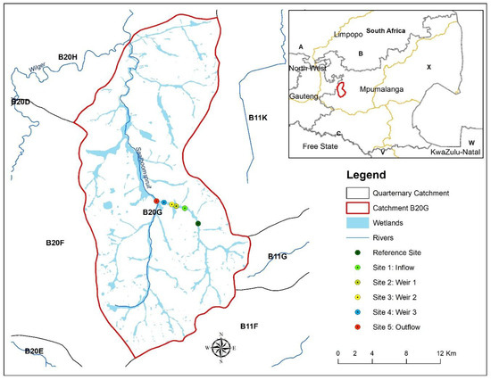 The Zaalklapspruit wetland covers an area of 139 ha. Due to acid mine drainage (AMD) from a non-operational underground coal mine upstream, its inflowing water is contaminated by metals and high sulphate concentrations [17]. The Zaalklapspruit wetland is an ecologically engineered valley-bottom wetland situated in Mpumalanga Province, South Africa, part of the Upper Olifants River quaternary catchment B20G [1], shown in Figure 1 (see Appendix A). The Mpumalanga Highveld constitutes 80% of national coal mining activity; hence, impacts of decanting mines on wetlands are unavoidable and detrimental to ecological infrastructure to some extent. The wetland has been classified as a ‘National Freshwater Ecosystem Area’ and falls in the ‘critically endangered wetland type’ category, hence identified as a Critical Biodiversity Area (CBA). Through ecological engineering, the size of the Zaalklapspruit wetland was increased by 9.4 hectares through the redirection of water flows using concrete structures in order to enlarge the wetland’s passive treatment surface area and reduce resident time [14,18].