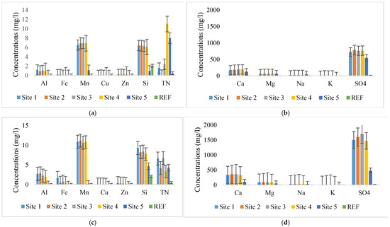 After the veldfire, a comparable pattern was noticed. The Al concentrations decreased from 2.92 mg/L at the inflow (Site 1) to 0.07 mg/L at the outflow, as shown in Figure 3c, reducing overall Al by 97.43%. The same trend was found for Fe, which decreased from 1.69 mg/L at the inflow to 0.01 mg/L (99.65%) at the outflow; Mn, from 10.86 mg/L to 0.17 mg/L (98.41%); Cu, from 0.02 mg/L to 0.01 mg/L (62.50%); and Zn, from 0.39 mg/L to 0.02 mg/L (94.87%) (Figure 3c). At the inflow, Site 1, the SO4 concentration was at 1502.9 mg/L, increasing to 1599.04, 1704.09 and 1471.36 mg/L at Sites 2, 3 and 4, respectively. However, the SO4 concentration decreased to 478.51 mg/L at the outflow, as shown in Figure 3d, resulting in an overall sulphate decrease by 68.16%.