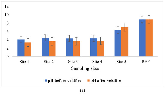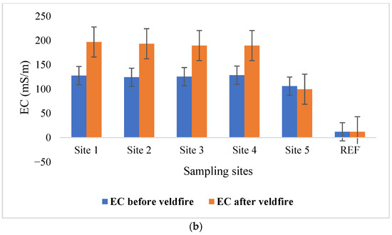 pH and electrical conductivity measured before and after the veldfire per site. (a) pH before and after veldfire; (b) EC before and after veldfire.