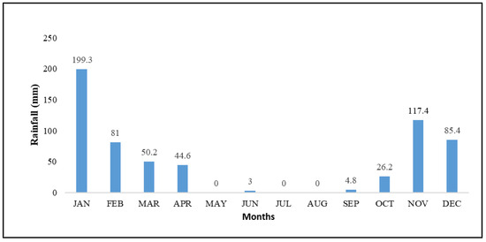 During the winter sampling (June 2020, i.e., dry season), only 3 mm of rainfall was recorded before the July 2020 veldfire, see Figure 5, whereas in the spring sampling (October 2020), 26.2 mm of rain was recorded. The average flow rate in June 2020 at the wetland inflow site was (0.271 m/s × 3 m × 0.15 m) 0.121 m3/s, increasing to (0.412 m/s 5.3 × 0.18 m) 0.393 m3/s in October 2020 after the veldfire. This increased flow rate in the upper catchment of the ecologically engineered wetland may have had a dilution effect, decreasing the proportion of pollutants observed in the wetland in the October 2020 water chemistry analyses. However, an increase in flow rate would also have decreased the residence time for passive treatment in the ecologically engineered wetland. Furthermore, a higher flow rate and the lower flow resistance due to burned-down macrophytes would also have played a role in reducing residence time for passive treatment by macrophytes in the wetland. A previous groundwater study by [41] showed that groundwater hydrochemical and stable isotope contents indicated that the ecologically engineered wetland was not supported by sub-surface water discharges during the dry and wet seasons.