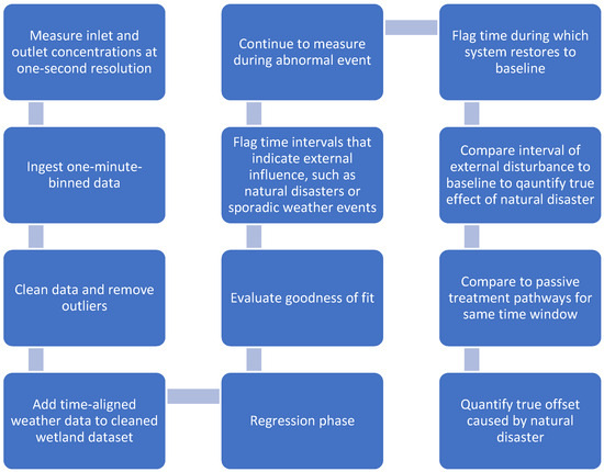 Transforming Equations (2) and (3) towards data-driven black box methods, by utilising the metrics outlined in Table 3 specifically for the quantification of natural disasters’ impact on the treatment capacity of ecologically engineered wetlands (or complex systems), relies on a pipeline that typically involves data ingestion (at 1 s intervals), pre-processing (cleaning data), model training (regressing), evaluation (goodness of fit) and deployment (new and values with ever-increasing accuracy), all executed continuously as new data are measured. The resulting black box method-driven digital twin can be represented as in Figure 7 below.
