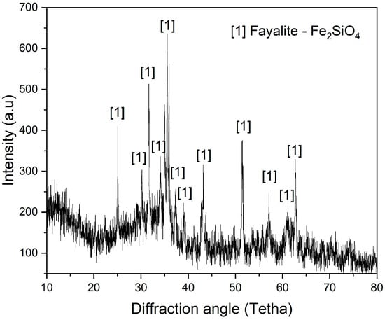 Figure 1 shows the XRD (X-ray diffractometer) analysis of synthetic copper slag flux. Analysis revealed fayalite (Fe2SiO4-01-071-1672 DB card number), primarily composed of FeO and SiO2. In our previous simulation experiments, the synthesized fayalite flux consisted of a structure that closely mirrored the fayalite structure found within the copper slag.