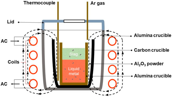 The experiment was conducted using a 30 kHz high-frequency induction furnace for the purpose of the experiment. A cooler, a controller, and a heater were all components of the furnace. The organization and composition of the experimental setup used in this investigation are thoroughly illustrated in a schematic diagram, which is shown in Figure 2. The samples were held within alumina crucibles that were placed inside graphite crucibles, which were used as heaters. A thermometer was positioned between graphite and alumina crucibles, with Al2O3 powder surrounding it, serving as insulation. With programmed settings, the experimental induction furnace was operated using the NP200 model thermo-controller made by Hanyoung Nux Co., Ltd., in Incheon city, Republic of Korea. By maintaining the furnace temperature above 1550 °C during adjustments, this method compromises the precision of the temperature of the liquid metal. With a channeled lid in place, argon and other materials were securely sealed inside the furnace. With a flow rate of 300 cc/min, argon gas was used to protect the crucible as it underwent both heating and cooling. After the material was completely melted, the process included a hold that lasted for 10, 20, and 30 min. After adding the oxidizer and flux agents one after another, with 10 min between each addition, the experiment came to an end. The furnace was steadily heated to 1550 °C at 20 °C/min. The sample, which was placed inside the furnace, cooled down until it reached room temperature.