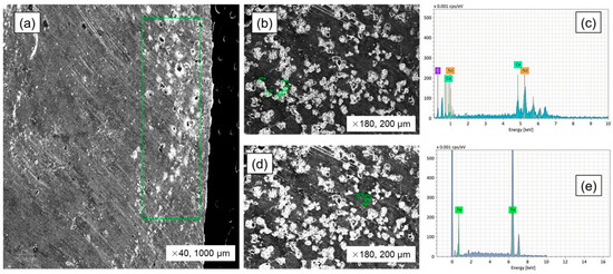 SEM–EDS analysis of the metal bulk in equilibrium smelting. (a) SEM image of metal bulk (presented by Erdenebold et al. [29]); (b,d) EDS point image of inclusions and matrix in the metal bulk; (c,e) EDS X-ray pattern of inclusions and matrix.