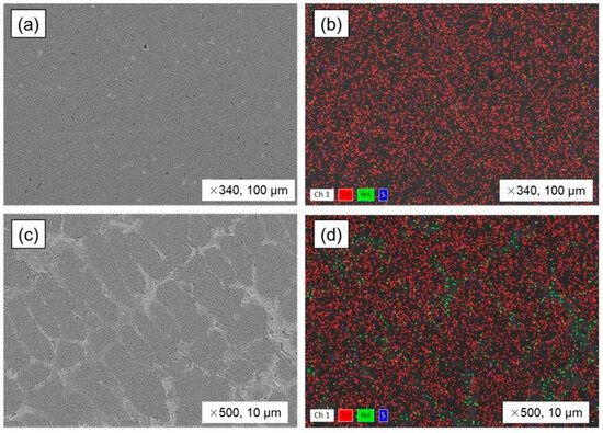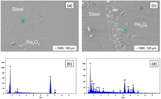 The bulk steel and un–melted magnet regions were analyzed for microstructure and elemental distribution as shown in Figure 9. The steel had a solid mass and minor porosity (Figure 9a,b). According to the EDS mapping analysis in Table 10, the steel bulk contains 1.35% of Nd and 0.11% of S. On the other hand, the un-melted magnet region presented a metallic structure that had white inclusions, which can be seen in Figure 9c,d. As shown in Table 10, the inclusions that were formed at the grain boundaries of the metal displayed a high concentration of Nd, with a distribution of 9.95%, and the inclusions also had a sulfur content of 0.21%.