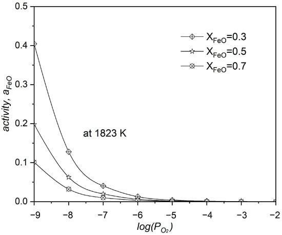 Figure 6 shows the correlation between FeO activity, its molar fraction, and oxygen partial pressure in the neodymium oxidation by FeO system. The system’s increased correlates with decreased FeO activity (), which is a clear sign that the reaction produces more Nd2O3. Increasing the FeO molar fraction within the system is known to increase value.