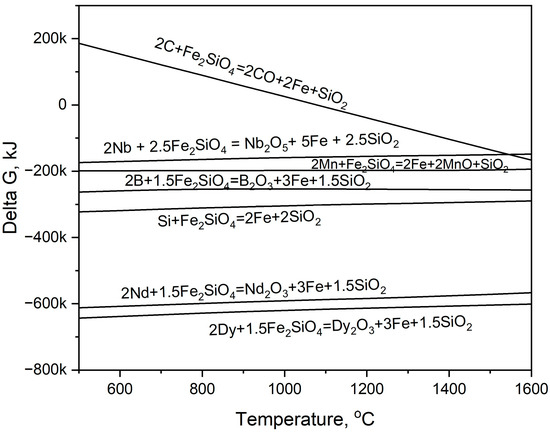 According to thermodynamic analyses, the increased oxygen partial pressure, which was caused by FeO, ultimately resulted in an enhancement of neodymium oxidation within the liquid metal. Equation (6) shows the oxidation reaction of REEs via copper slag in form of the fayalite eutictec; this reaction’s demonstration served as the main aim of our research. In addition, FeO can also oxidize C, Si, and Mn in the liquid metal; this occurs at the same time as the oxidation of REEs, as shown in Equations (7) and (8).