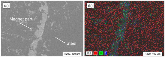 Analyzing the boundary between the metal bulk and un-melted magnet part formed during smelting. (a) SEM image and (b) EDS mapping image.
